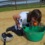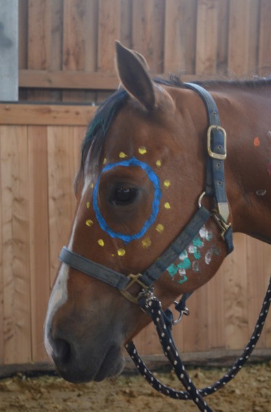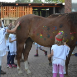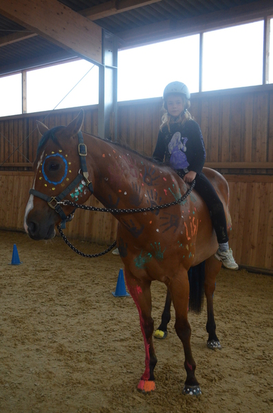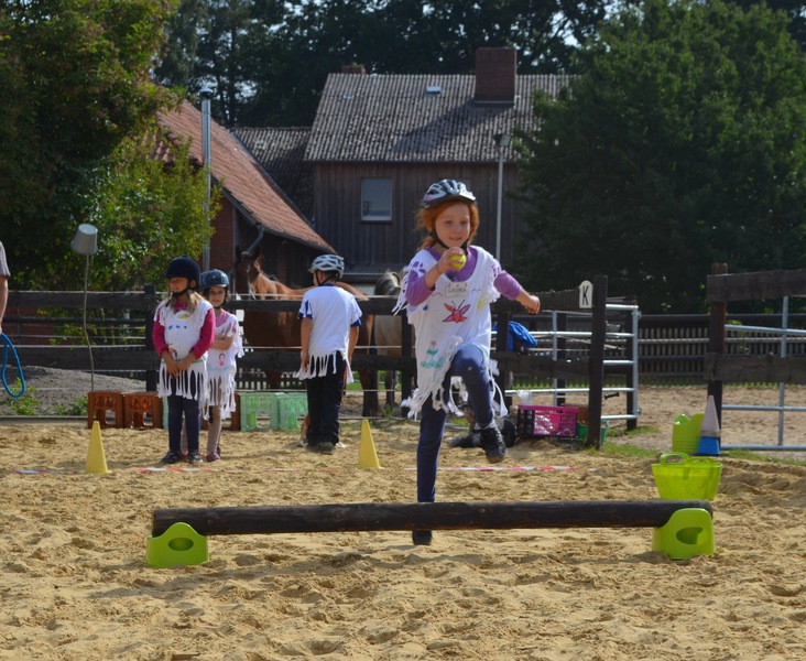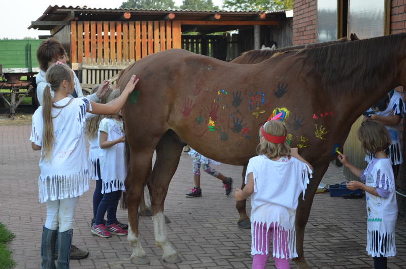 Den nächsten Tag begannen wir mit einem gemeinsamen Frühstück in der Reithalle, bevor die Kinder in ihren Gruppen dann ihre Pferde fertig machten. ,,Auf zu den Reiterspielen" hieß es, ganz nach dem Motto ,,Indianertage" natürlich ohne Sattel. Die Pferde bekamen alle ihre Indianer Bemalung mit Fingermalfarben und dann ging es los. In Gruppen traten die Kinder mit ihren Pferden bei kniffligen Spielen gegeneinander an. Es ging in verschiedenen Spielen mit und ohne Pferd um Schnelligkeit und Geschicklichkeit und natrülich Teamgeist! Am Ende gab es für jedes Kind eine Medallie und eine Urkunde!
