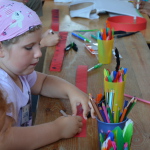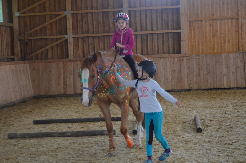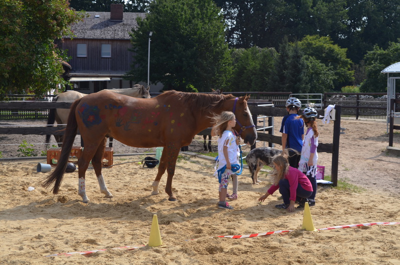 Schnell wuchs die Mädelstruppe zu einem guten Team zusammen und wir bastelten Steckenpferde aus Schwimmnudeln, malten die Pferde mit Fingermalfarben für die bevorstehenden Reiterspiele ohne Sattel an und hatten insgesamt sehr viel Spaß.