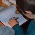 Während des Führtrainings gab es für die Kids ein kleines Pferdequizz. Bei der darauffolgenden Mittagspause konnten sich die Kinder mit Würstchen vom Grill und selbstgemachten Nudelsalat stärken bevor es dann wieder zu einer kleinen Theorieeinheit ging. Jetzt stand die Haltung und Fütterung von Pferden auf dem Plan, sowie die korrekte Ausrüstung von Pferd und Reiter. Die Kinder schrieben und malten fleißig in ihren Arbeitsmappen.